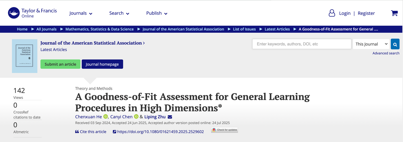 近日,我院博士生何辰轩作为第一作者的论文“A Goodness-of-Fit Assessment for General Learning Procedures in High Dimensions”被统计学顶级期刊Journal of the American Statistical Association接收。