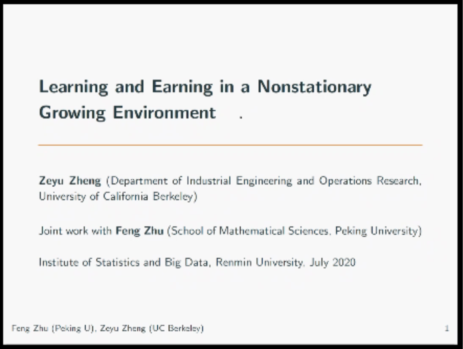 2020年7月17日上午,美国加州伯克利大学工业工程与运筹系Zeyu Zheng助理教授应我院邀请在线进行了以“Learning and Earning in a Nonstationary Growing Environment”为主题的报告会。