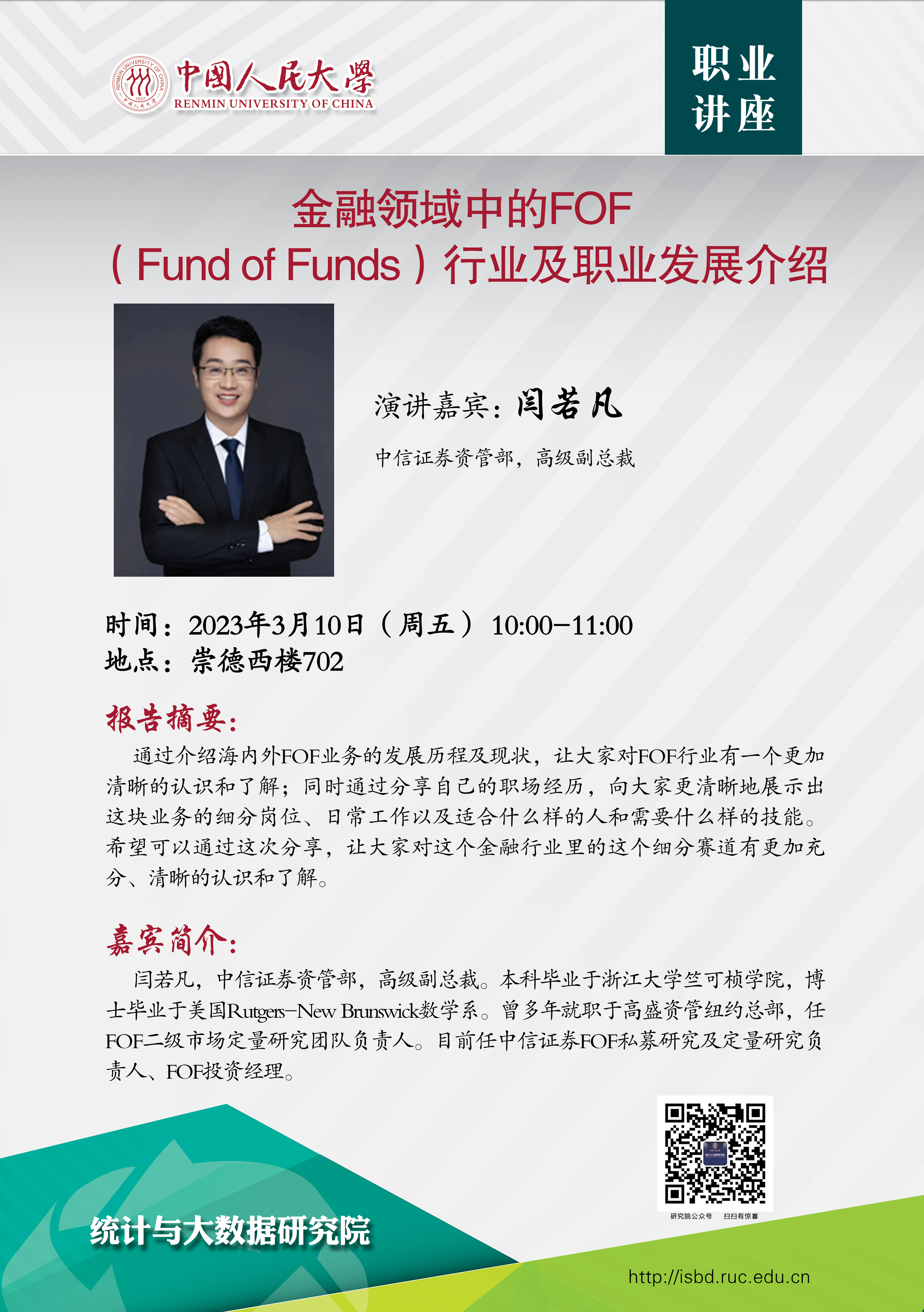 预告:我院将邀请中信证券资管部高级副总裁闫若凡到院进行职业讲座