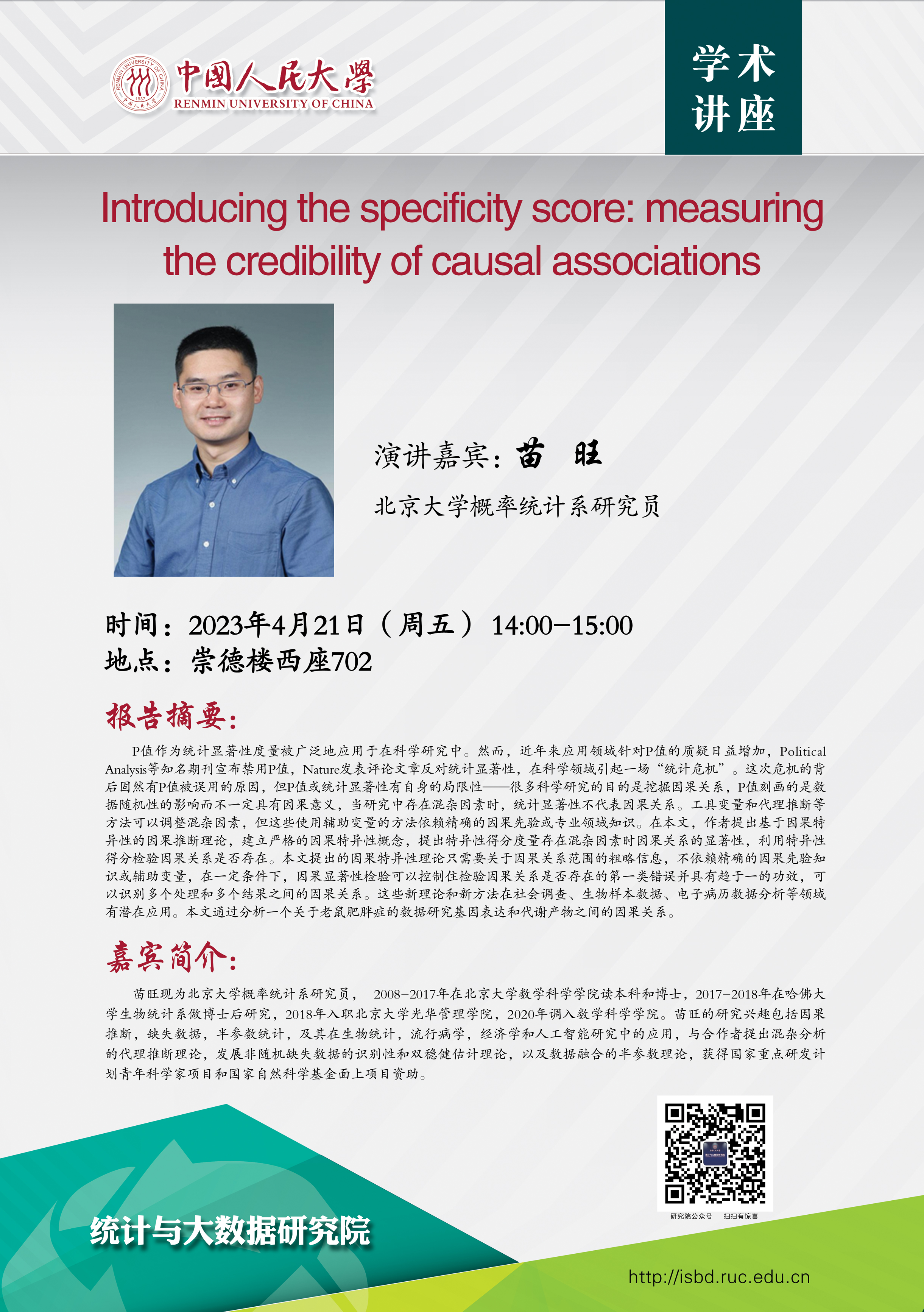 预告:我院将邀请北京大学苗旺研究员到院讲座