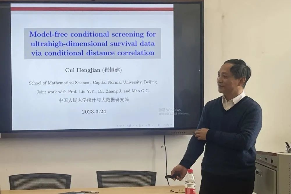2023年3月24日上午10:00-11:00,首都师范大学数学科学学院崔恒建教授在崇德西楼702会议室进行了题目为“Model-free conditional screening for ultrahigh-dimensional survival data via conditional distance correlation”的学术讲座。