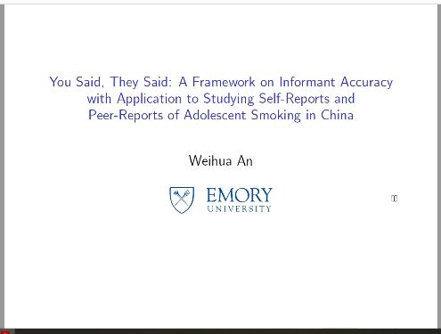 2020年10月23日上午,美国埃默里大学公共卫生学院Weihua An副教授应我院邀请在线进行了以“You Said, They Said: A Framework on Informant Accuracy with Application to Studying Self-Reports and Peer-Reports of Adolescent Smoking in China”为主题的报告会。