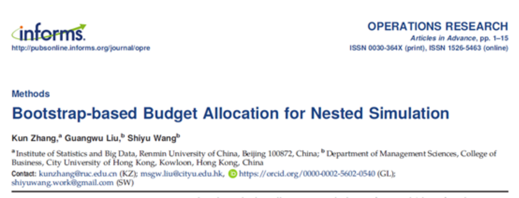 51吃瓜网 张琨助理教授、香港城市大学商学院管理科学系刘光梧教授和王诗雨博士在嵌套随机仿真(Nested simulation,NS)研究方面取得重要进展,相关研究成果在线发表在运筹学领域国际最顶尖期刊《Operations Research》上。经从《Operations Research》官网查询,本论文是该期刊上以Renmin University of China署名的第二篇论文。