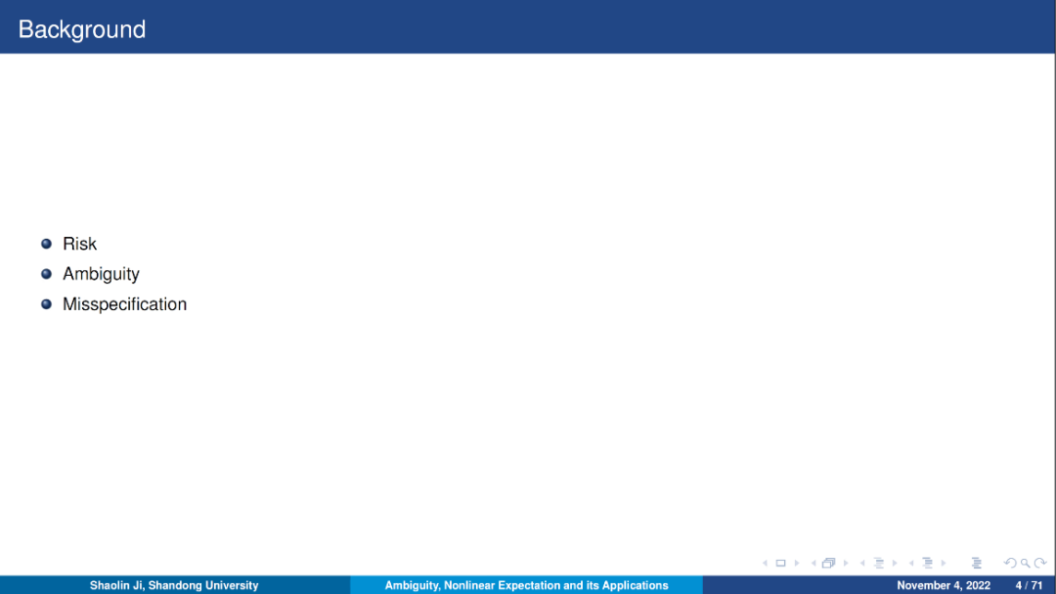 2022年11月4日,山东大学嵇少林教授应我院邀请进行了以“Ambiguity, Nonlinear Expectation and Its Applications”为主题的讲座。