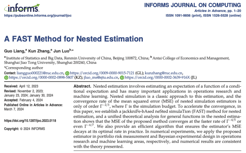 我院2021级博士生梁果与其导师张琨助理教授,上海交通大学安泰经济与管理学院的罗俊教授合作的论文“A FAST Method for Nested Estimation”在管理科学顶级期刊,UT-Dallas 24期刊《INFORMS Journal on Computing》在线发表。《INFORMS Journal on Computing》为美国运筹学和管理学研究协会(INFORMS)季刊,是管理学24种国际顶级期刊(UTD24 Top Journals)之一,主要发表运筹学与计算科学交叉领域的最新研究成果。