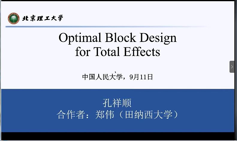 2020年9月11日上午,北京理工大学数学与统计学院孔祥顺助理教授应我院邀请在线进行了以“Optimal Block Design For Total Effects”为主题的报告会。