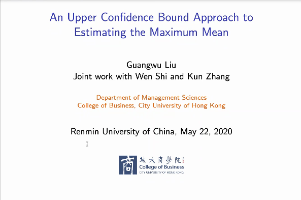 2020年5月22日上午,香港城市大学刘光梧教授应我院邀请在线进行了以“An Upper Confidence Bound Approach to Estimating the Maximum Mean”为主题的报告会。