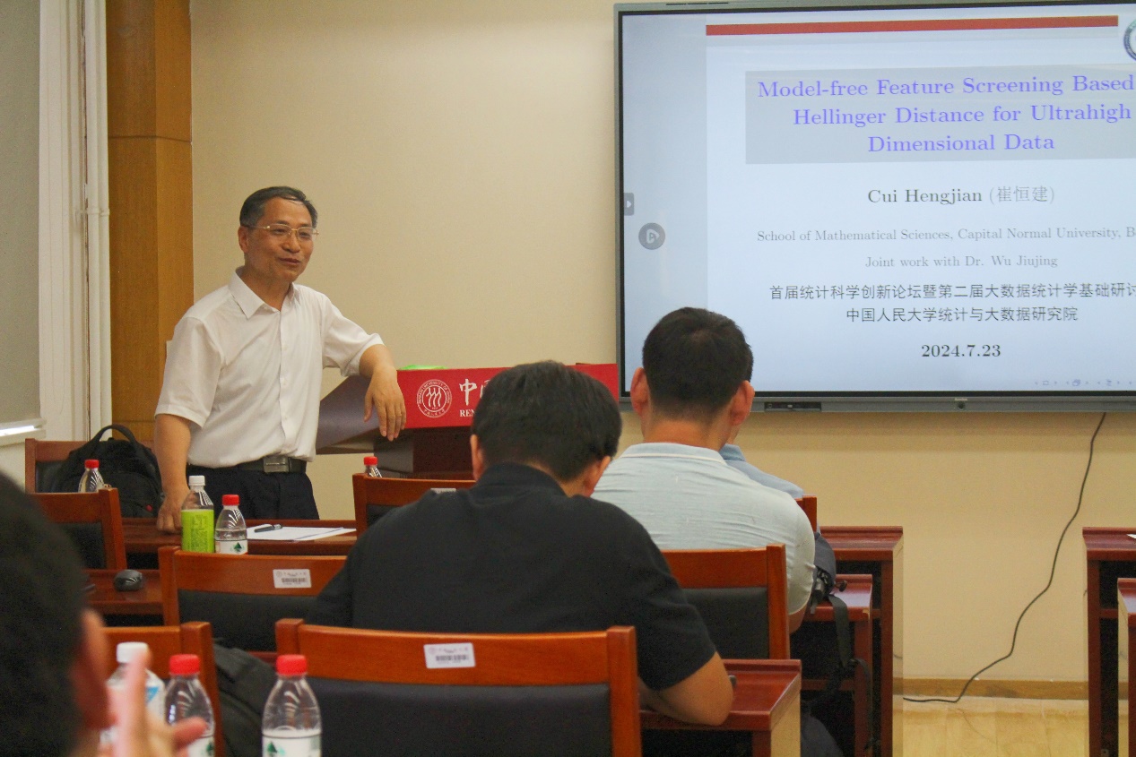下午,首都师范大学崔恒建教授作了题为“Model-Free Feature Screening Based on Hellinger Distance for Ultrahigh Dimensional Data”的报告。