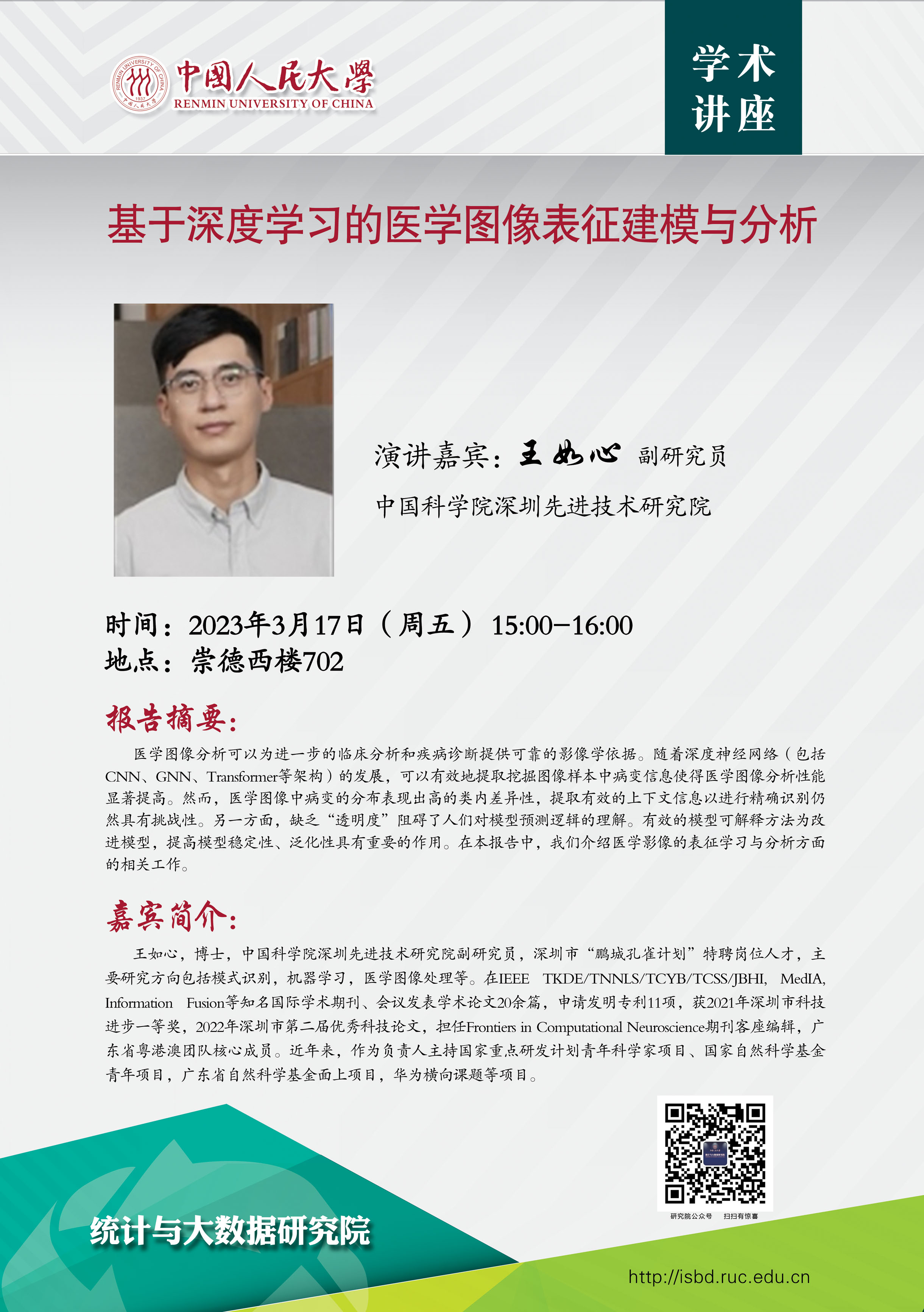 预告:我院将邀请中国科学院深圳先进技术研究院副研究员王如心到院进行学术讲座