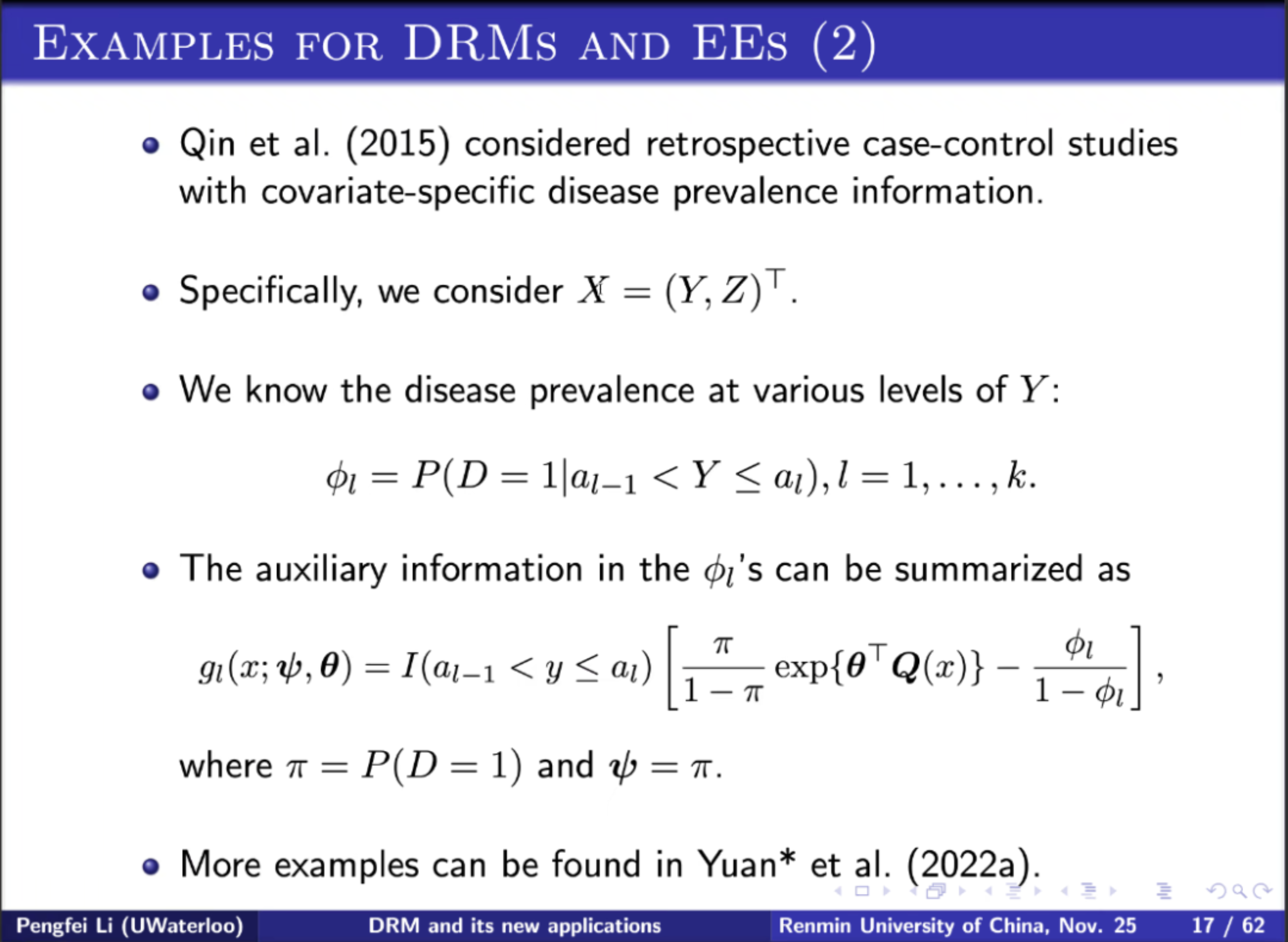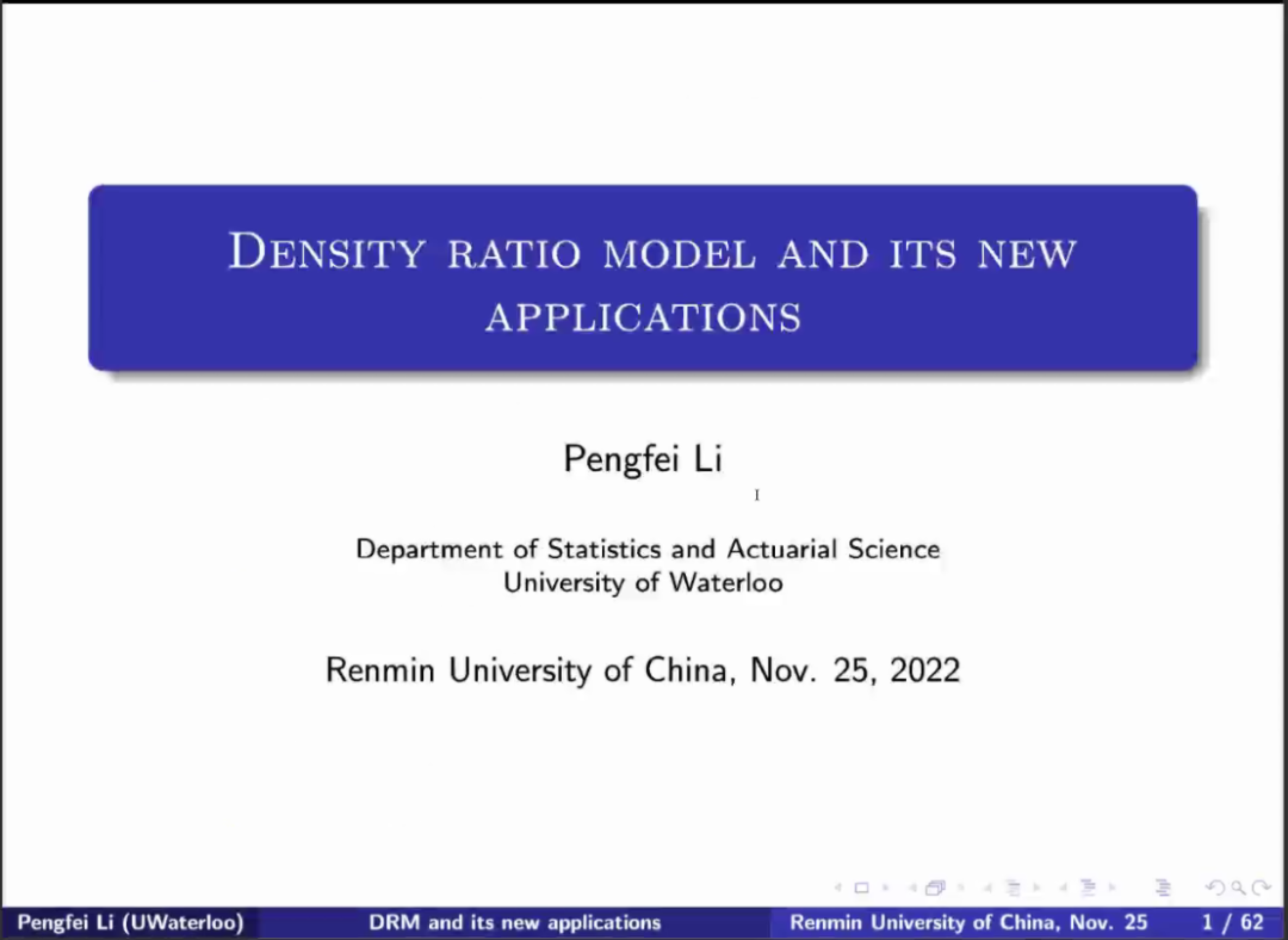 2022年11月25日上午10:30,滑铁卢大学教授Pengfei Li应我院邀请进行了以“Density ratio model and its new applicaitons”为主题的线上讲座。