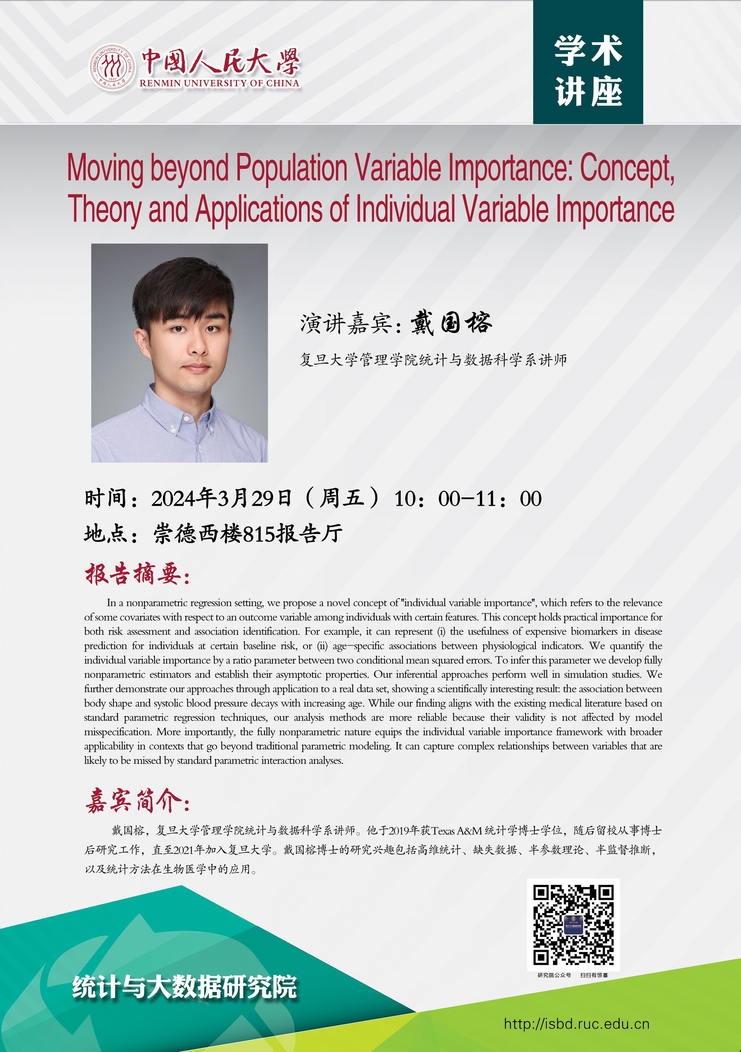 预告:我院将邀请复旦大学管理学院统计与数据科学系讲师戴国榕到院讲座