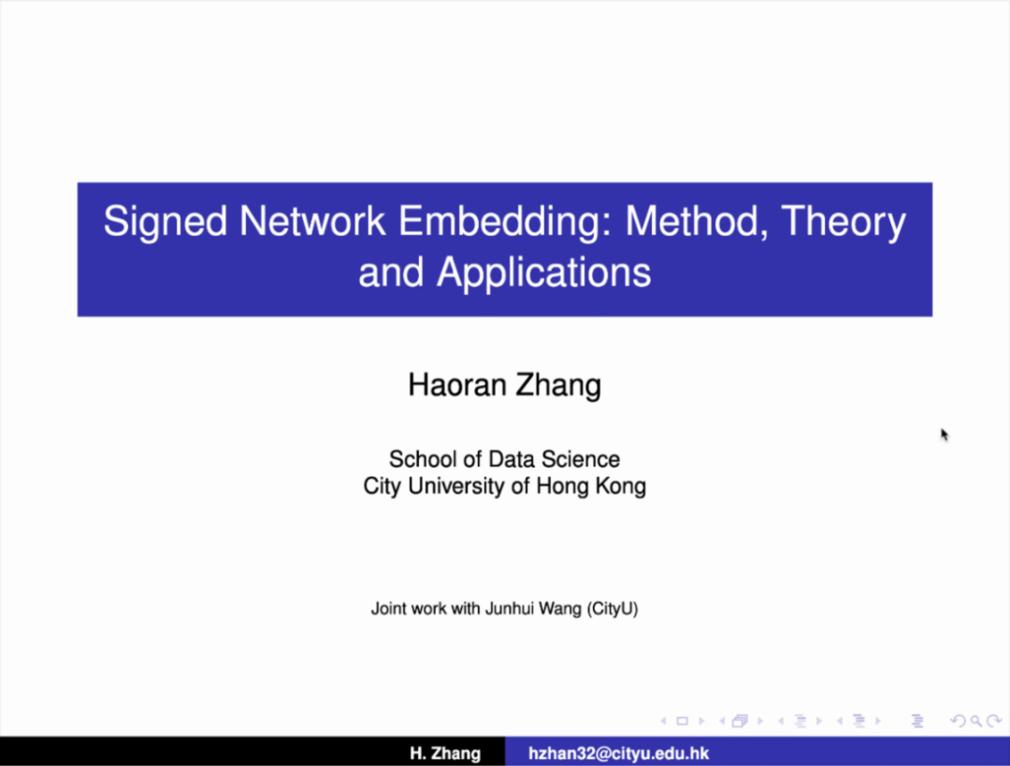 2022年5月27日,香港城市大学大学张浩然博士应我院邀请进行了以“Signed Network Embedding with Application to Simultaneous Detection of Communities and Anomalies”为主题的讲座。