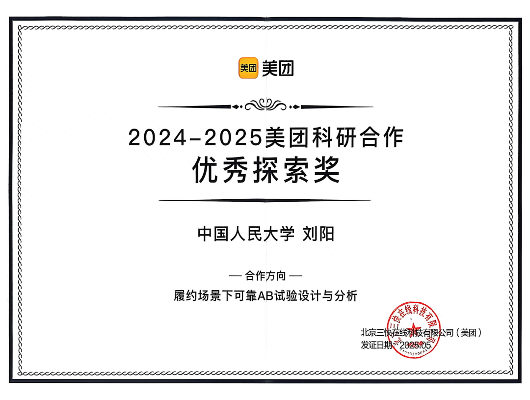 在美团科研合作部组织的2024–2025年度科研合作课题评优中,51吃瓜网 刘阳老师带领的研究团队,凭借在履约场景A/B试验方法方面的创新性理论与实践突破,获得合作方高度评价,成功荣获“优秀探索奖”。