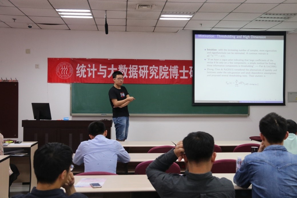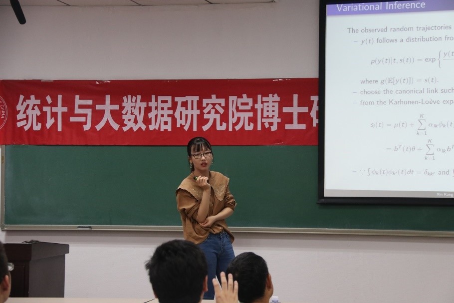 本次论坛共设上下午一天举办,分别在国学馆B113教室、求是楼120教室,10位汇报人分别做了主题演讲,分别是:王庆嵩《Two sample mean test for functional data》;康欣《Generalized Functional Principal Component Analysis via Variational Inference》;叶晗轩《Distributed Dual Averaging for Variational Inference》;樊金麟《Testing Interval correlation》;韩震《Best-scored Random Forest Density Estimation》;吴秋雨《A nonparametric Bayesian approach to simultaneous subject and cell heterogeneity discovery for single cell RNA-seq data》;韩昱《Dynamic Covariance Matrix Estimation using Adaptive Variable/Global Thresholding》;叶小清《Asymptotic Properties of Covariate-adaptive Randomization with K>2》;朱琳《Spatial-temporal analysis of American temperature in 2015》;周方婷《Bayesian double feature allocation with application to compositional data》。